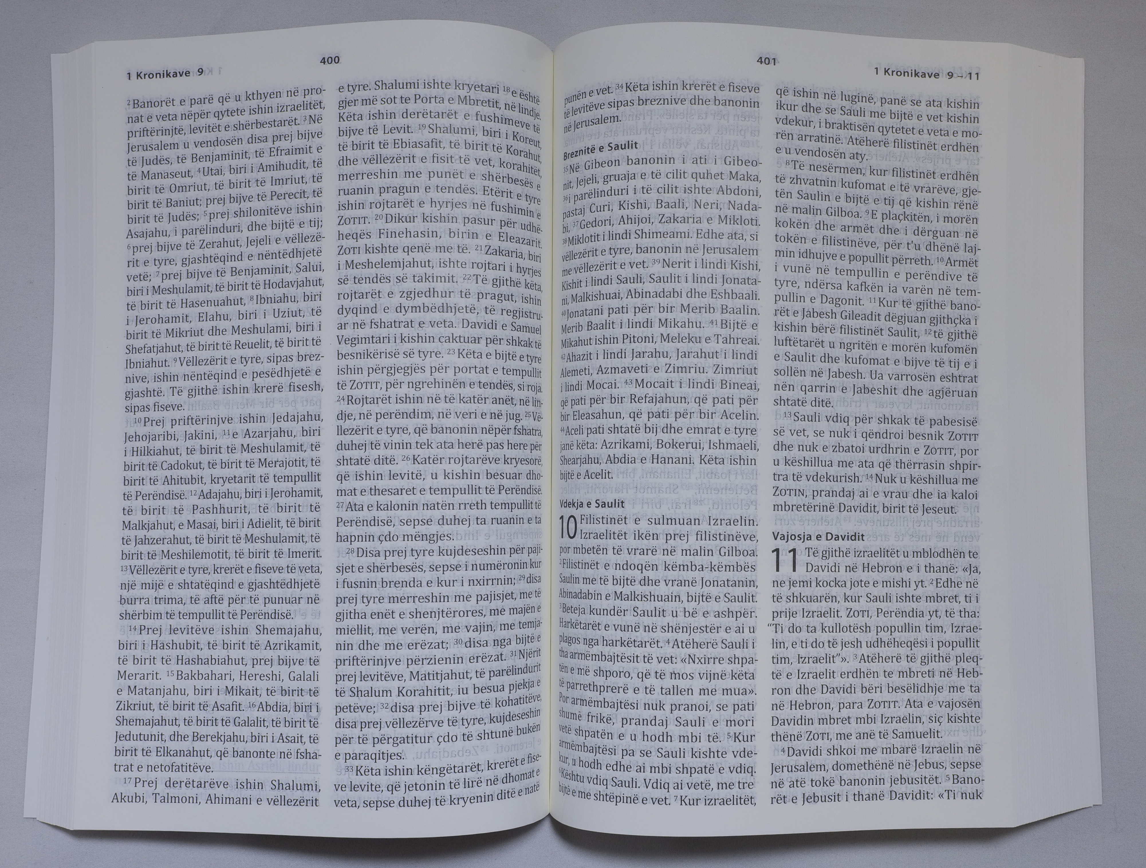 Diese albanische Bibelausgabe ist zweispaltig gesetzt und enthält eine Zeittafel.