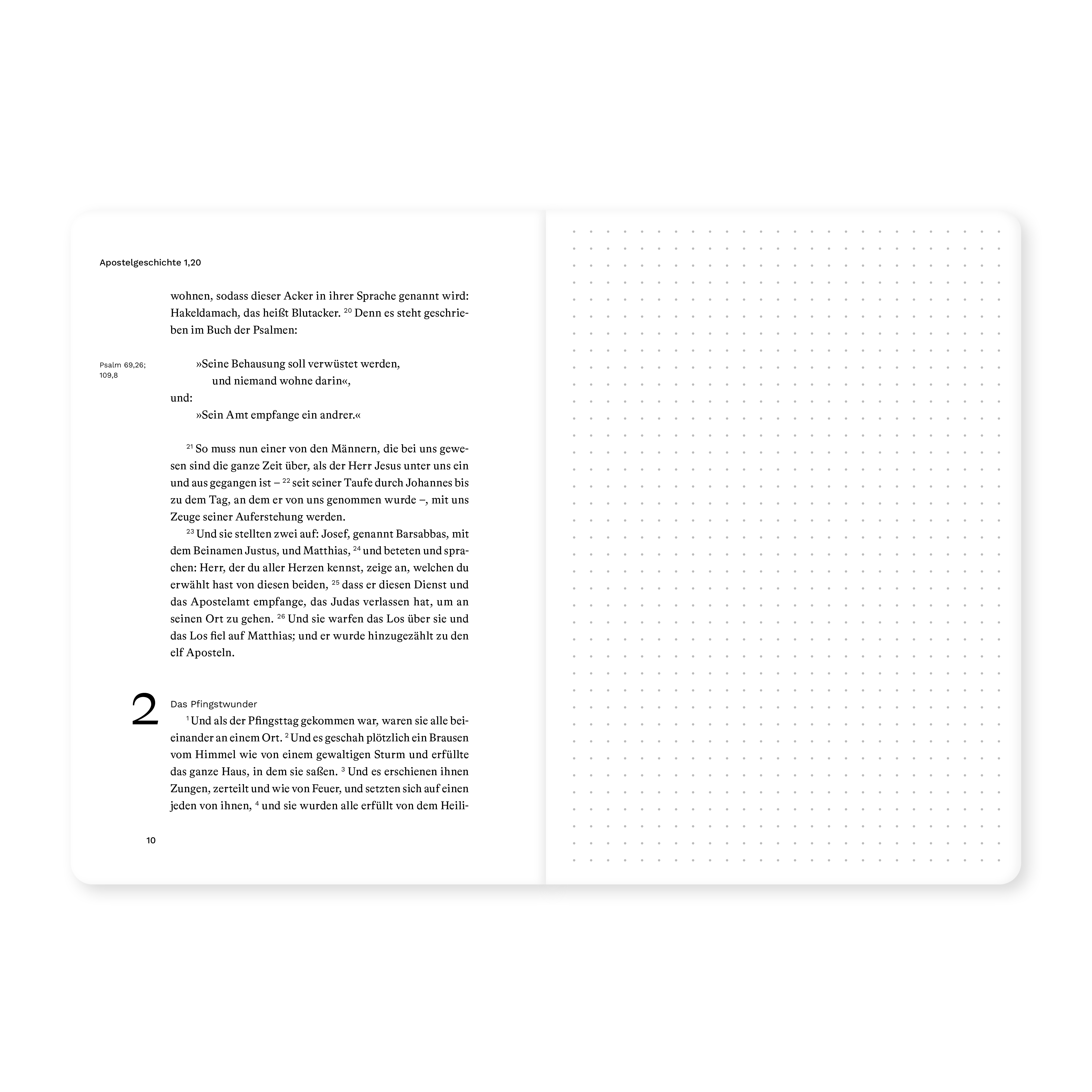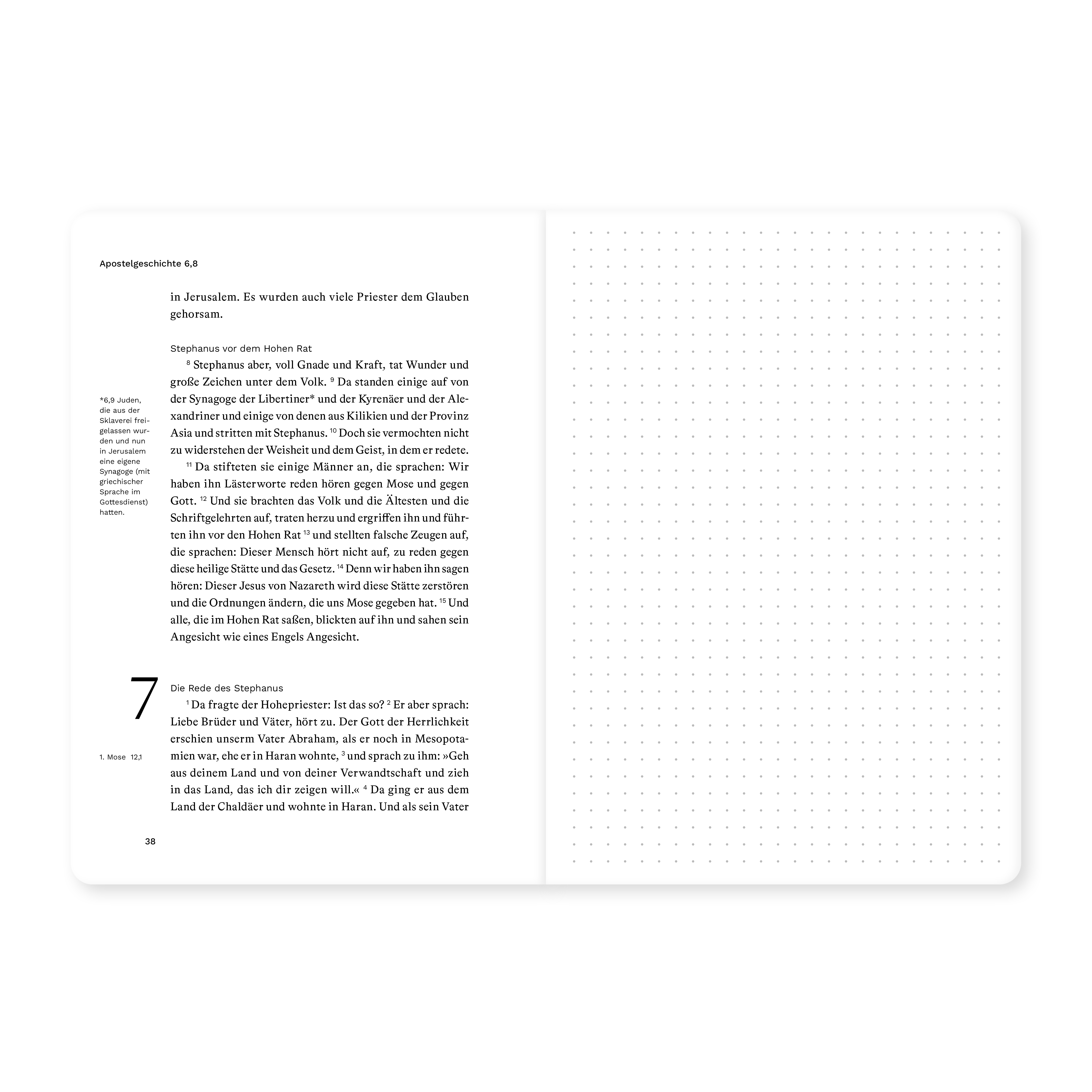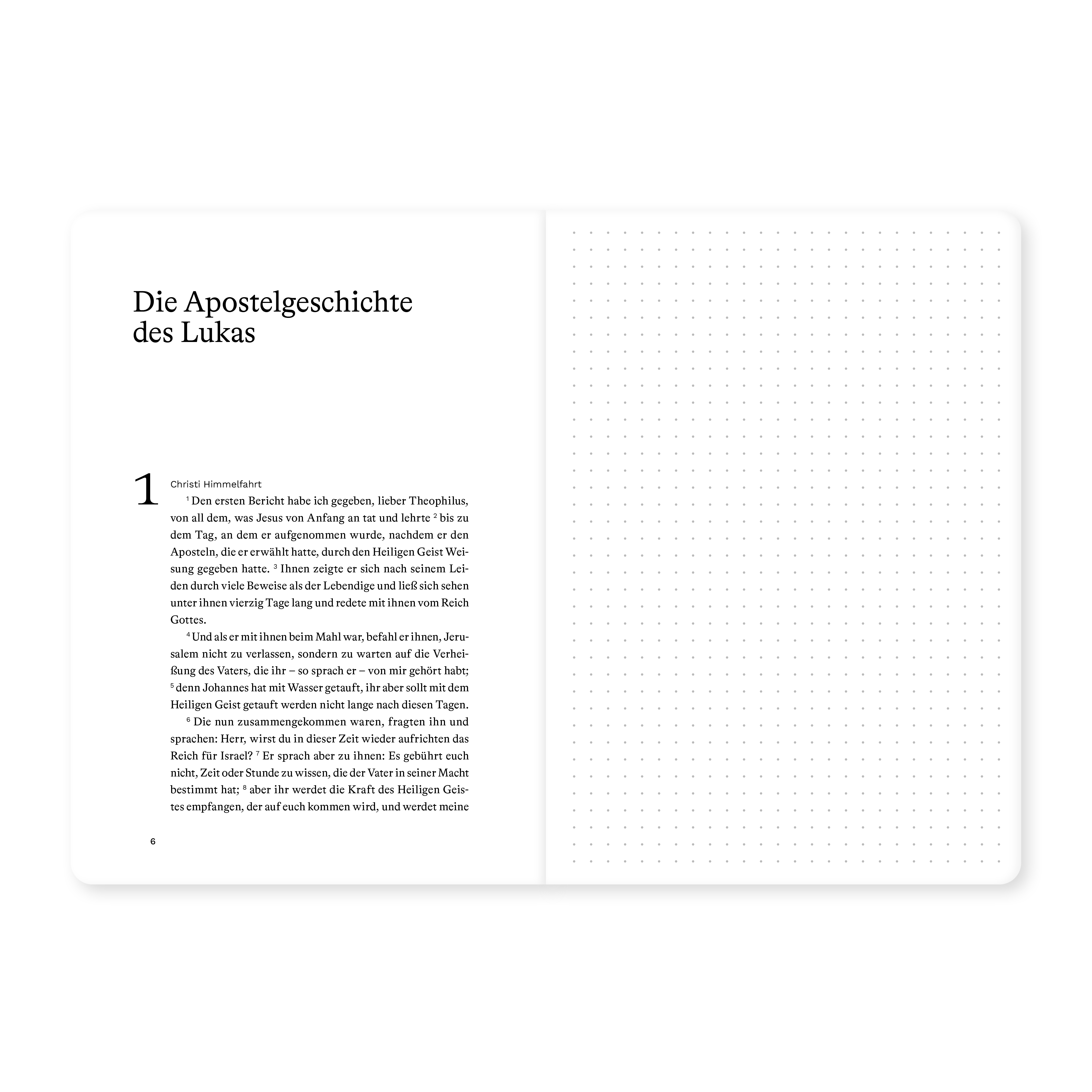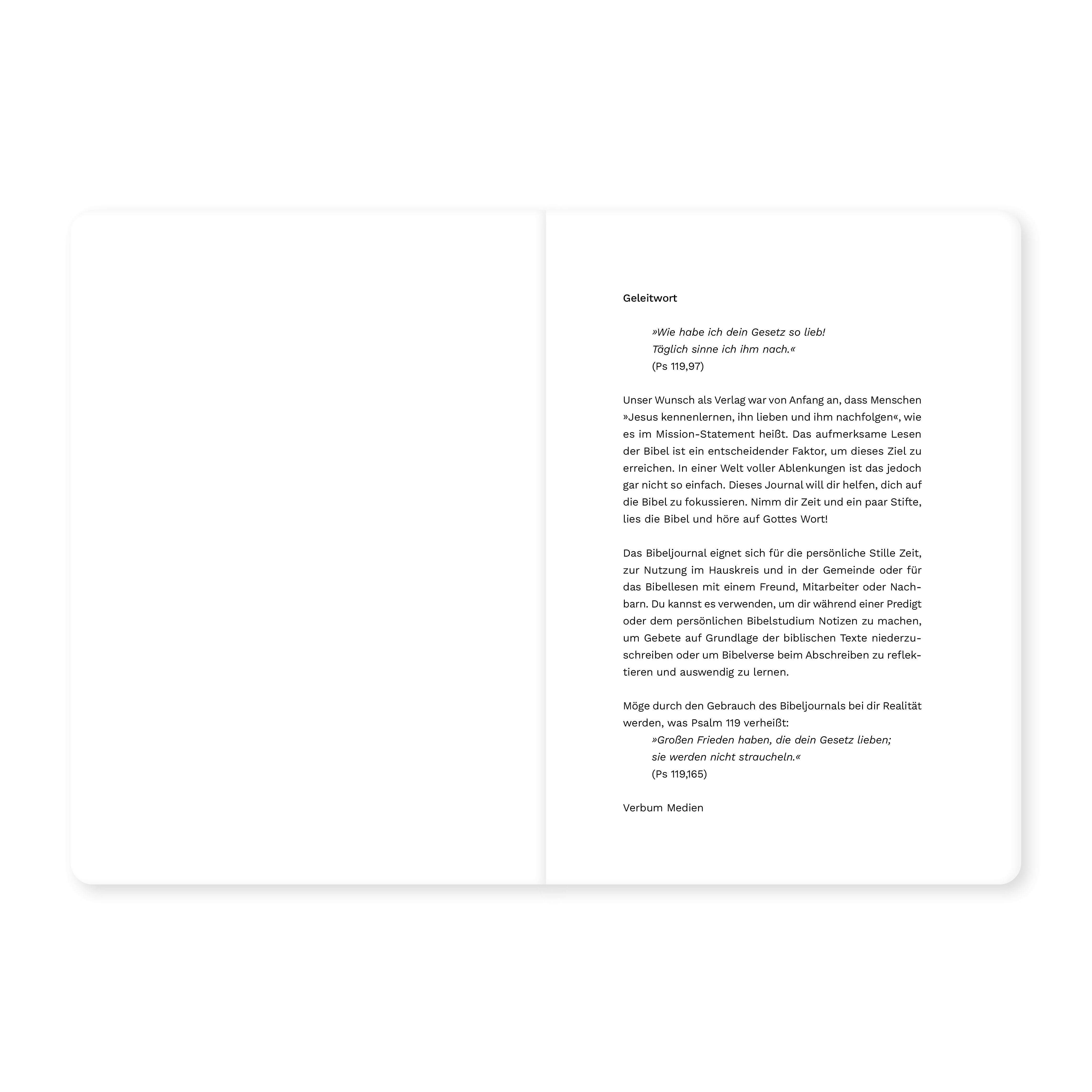 Die hochwertigen Bibeljournale wollen helfen, sich auf die Bibel zu fokussieren. Auf der linken Seite ist der Bibeltext (Luther 2017) abgedruckt, auf der rechten Seite ist genügend Platz für eigene Notizen. Die Bibeljournale eignen sich für die persönliche Stille Zeit, zur Nutzung im Hauskreis und in der Gemeinde.