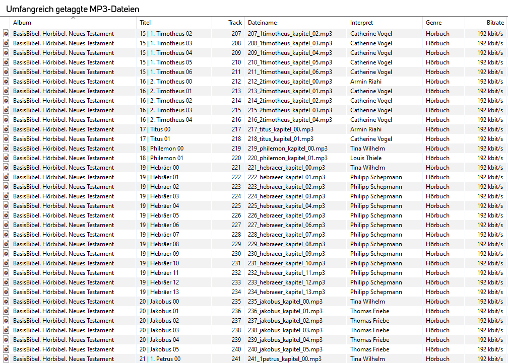 Nun gibt es die Bibeltexte des Neuen Testaments der BasisBibel endlich auch als Hörfassung. Eingesprochen von erfahrenen und jungen Sprecherinnen und Sprechern mit Bühnen-, Hörfunk- und Hörbucherfahrung.