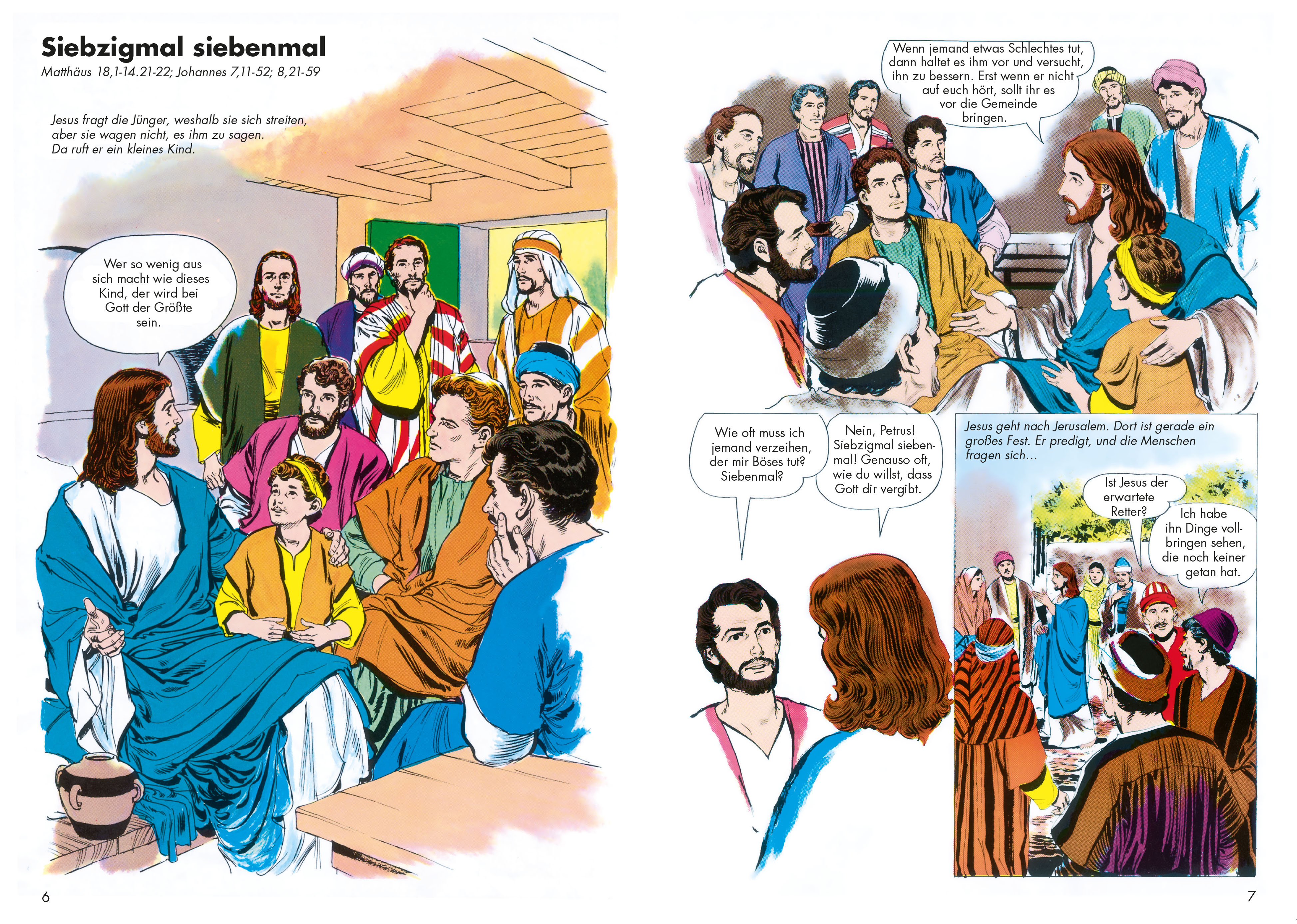 Die Ausgaben der Reihe »Die Bibel im Bild« sind die Klassiker der Bibel-Comics. Das Comic-Heft 12 enthält:Die Welt, in die Jesus kam - Das Evangelium nach Matthäus, Markus, Lukas und JohannesDer Wegbereiter - Lukas Kapitel 1, Vers 57-80; Lukas Kapitel 2, Vers 1-5; Matthäus Kapitel 1, Vers 18-25Die Nacht, in der die Engel sangen - Lukas Kapitel 2, Vers 7b-15Ein König ist geboren - Lukas Kapitel 2, Vers 7 und 16-20; Matthäus Kapitel 2, Vers 1-8Flucht in der Nacht - Matthäus Kapitel 2, Vers 9-14Das Kind im Tempel - Matthäus Kapitel 2, Vers 16-23; Lukas Kapitel 2, Vers 40-52Die Versuchung - Lukas Kapitel 3, Vers 1 bis Lukas Kapitel 4, Vers 4Die ersten Jünger - Lukas Kapitel 4, Vers 5-13; Johannes Kapitel 1, Vers 35-46Sechs Wasserkrüge - Johannes Kapitel 1, Vers 47-51; Johannes Kapitel 2, Vers 1-11 und 23-25; Johannes Kapitel 3, Vers 1-2Ein Ratsherr sucht Rat - Johannes Kapitel 3, Vers 3 bis Johannes Kapitel 4, Vers 6; Lukas Kapitel 3, Vers 19-20Eine Frau wundert sich - Johannes Kapitel 4, Vers 6-44; Lukas Kapitel 4, Vers 16-28Ein neuer Beruf für Fischer - Lukas Kapitel 4, Vers 29-37; Markus Kapitel 1, Vers 16-31; Markus Kapitel 2, Vers 1-3Durch das Dach ins Haus - Markus Kapitel 2, Vers 1-12Die Bergpredigt - Lukas Kapitel 6, Vers 12-16; Matthäus Kapitel 5 bis 7; Matthäus Kapitel 8, Vers 5-13; Matthäus Kapitel 13, Vers 45-46; Markus Kapitel 4, Vers 35-37Sturm auf dem See - Markus Kapitel 4, Vers 37-41; Markus Kapitel 5, Vers 1-24 und 35Die spottende Menge - Markus Kapitel 5, Vers 36-43; Matthäus Kapitel 9, Vers 35 bis Matthäus Kapitel 11, Vers 1; Matthäus Kapitel 14, Vers 1-13; Matthäus Kapitel 11, Vers 7-19; Johannes Kapitel 6, Vers 1-10Kein Thron auf Erden - Johannes Kapitel 6, Vers 11-15, Matthäus Kapitel 14, Vers 23-30Für wen haltet ihr mich? - Matthäus Kapitel 14, Vers 30-36; Johannes Kapitel 6, Vers 22-71; Markus Kapitel 7, Vers 1-23; Matthäus Kapitel 16, Vers 13-26; Mattäus Kapitel 7, Vers 1-2_____________________________________________________________Bei Fragen zur Produktsicherheit wenden Sie sich bitte an:Deutsche BibelgesellschaftBalinger Str. 31 A70567 Stuttgartproduktsicherheit@dbg.de