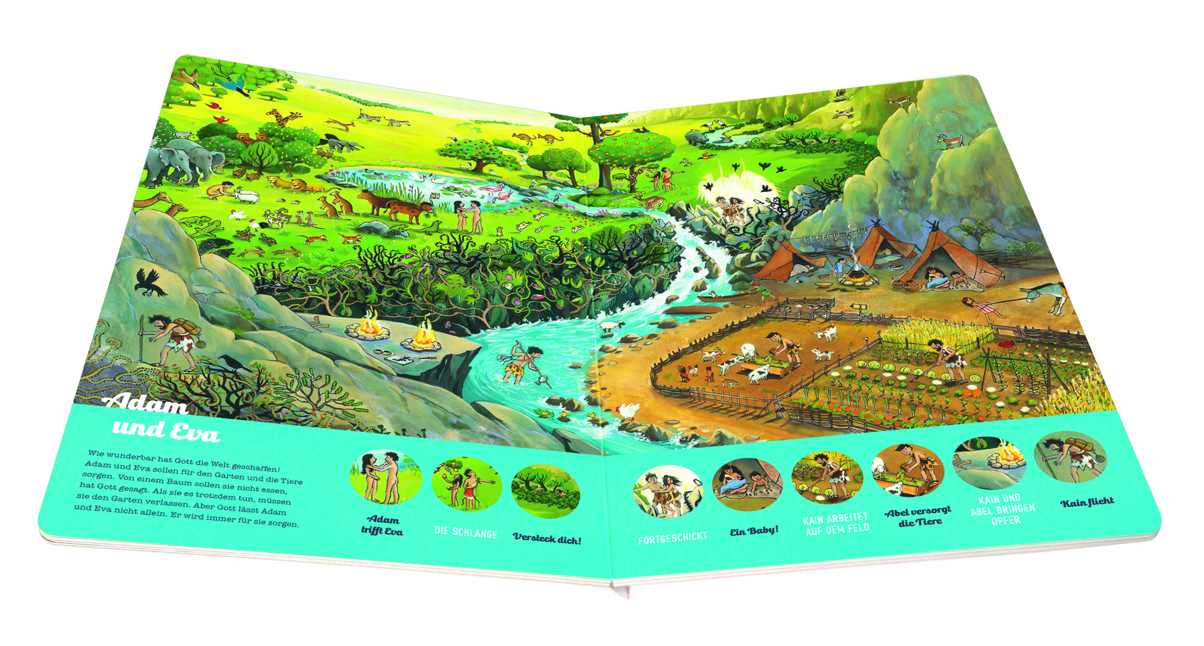 Dieses großformatige Pappbilderbuch enthält auf acht Doppelseiten die Panorama-Bilder aus der beliebten "Such-Bibel" von Marijke ten Cate. Vergrößerte Bildausschnitte am Fuß jeder Seite können in den Panoramen wiederentdeckt und gefunden werden. Dazu gibt ein kurzer Text zum Vorlesen Orientierung und Einblick in das Leben der jeweils dargestellten biblischen Figur. Auf diese Weise werden den kleinen Betrachtern spielerisch 75 biblische Geschichten und Geschehnisse vermittelt.