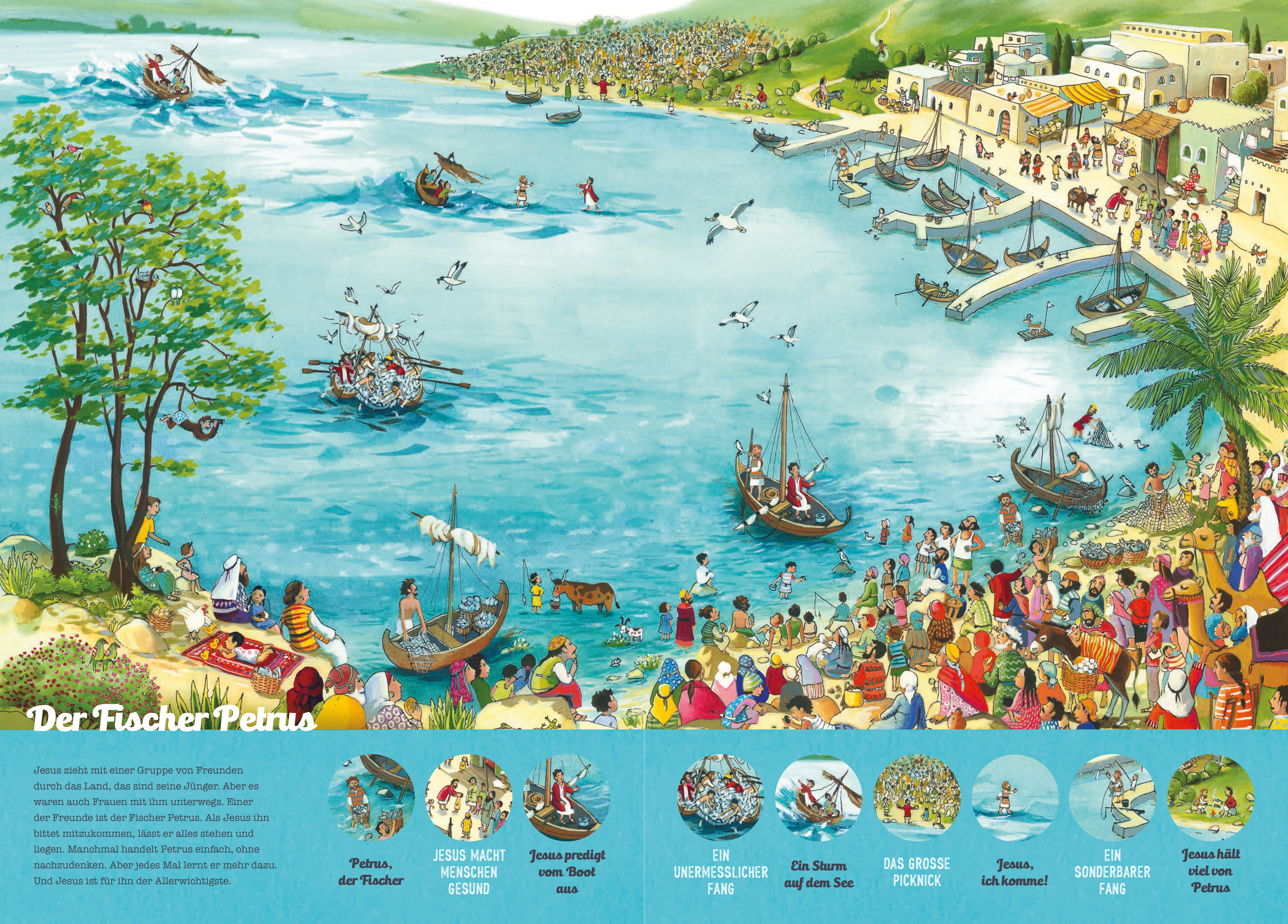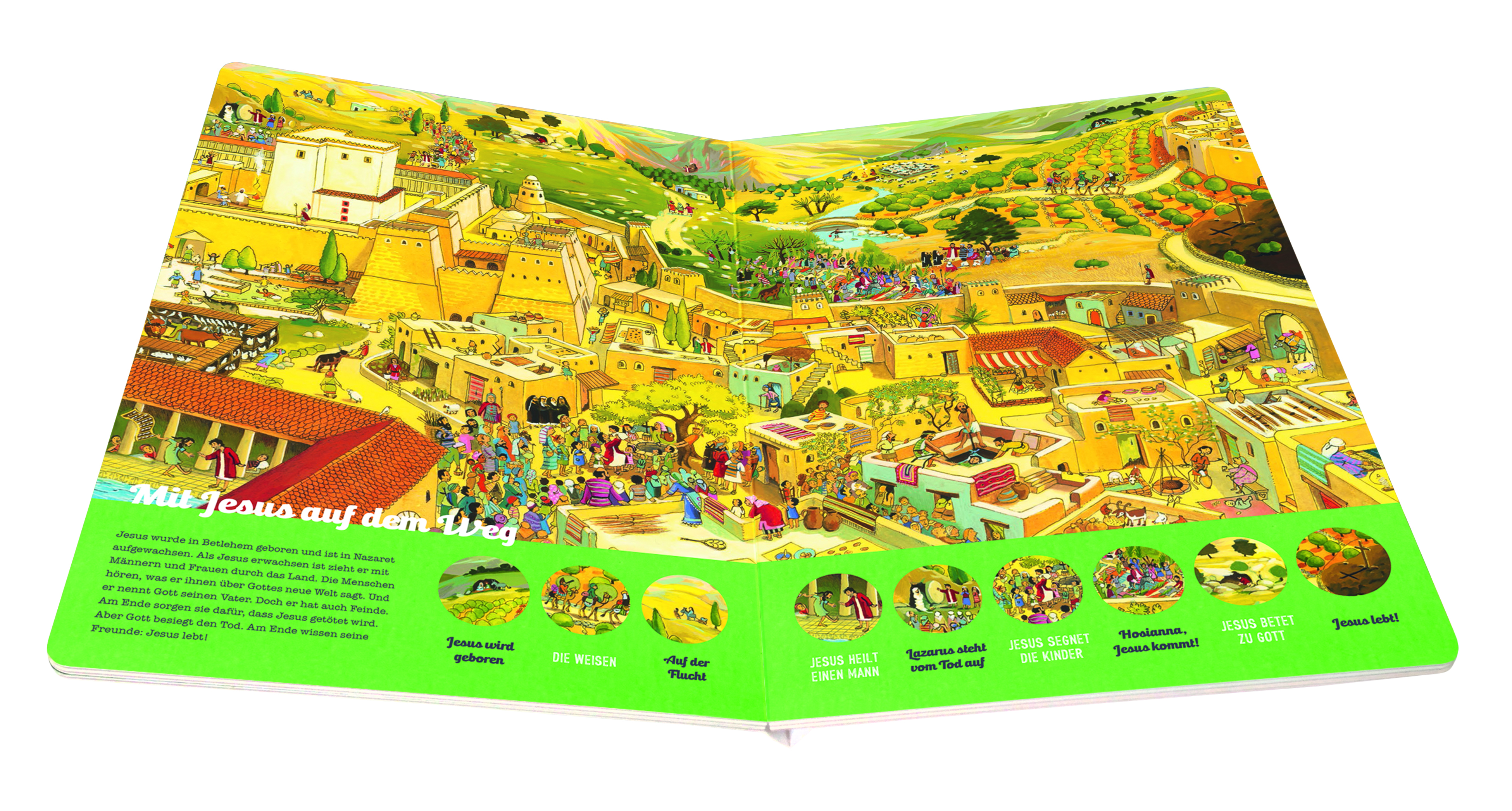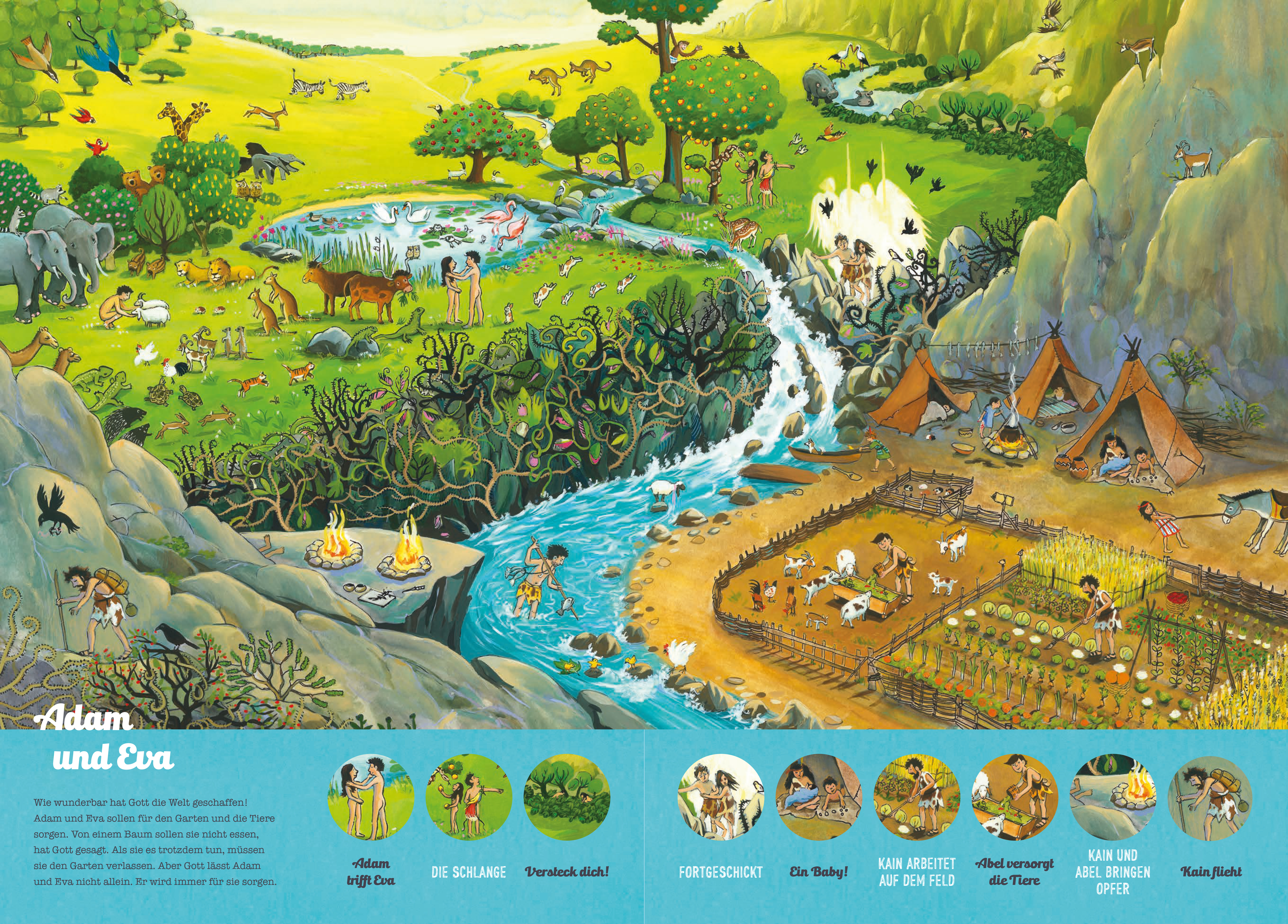 - Acht Panoramaseiten mit farbigen Motiven aus der Bibel