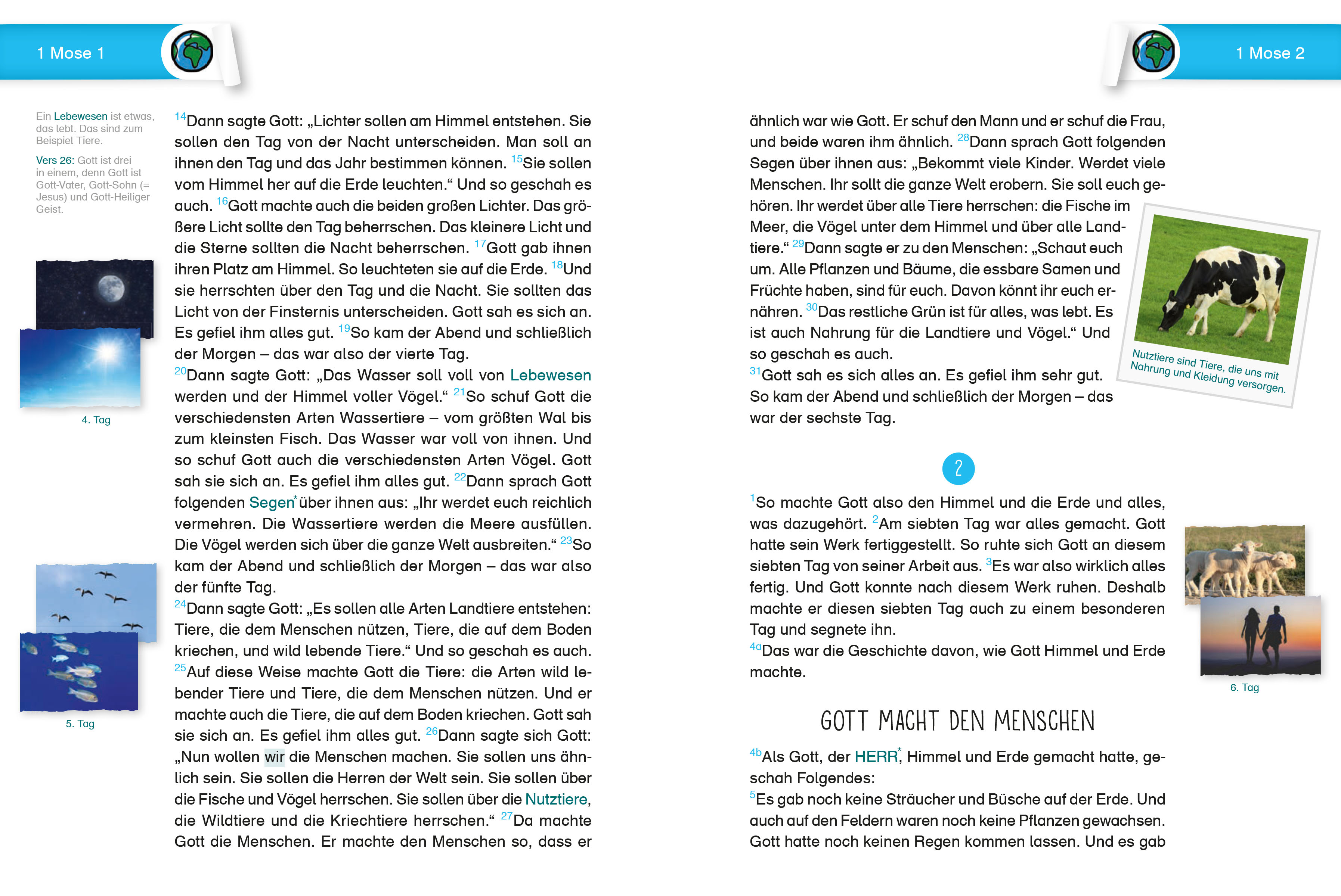 Die Wortwahl der Einsteiger-Bibel ist durch einen Sprachschlüssel auf den Wortschatz von Grundschülern abgestimmt und die maximale Satzlänge beträgt 15 Wörter. Besondere Gestaltungselemente fördern dabei die Lesemotivation. Zudem bietet die Ausgabe zusätzliche Informationen zu Schlüsselbegriffen des Bibeltextes, sodass sich die Kinder den Inhalt des biblischen Textes selbstständig erschließen können.