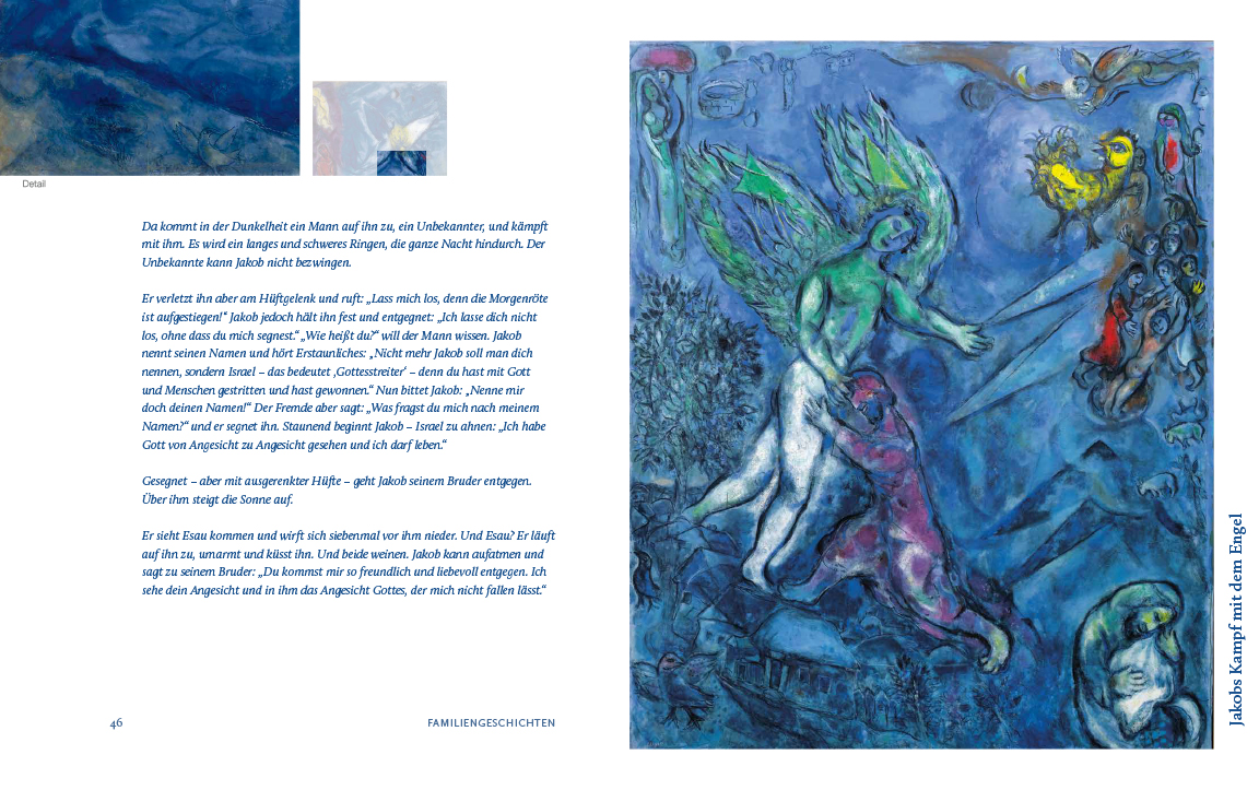 Kunst und Bibelerlebnis für Kinder sind in diesem Band vereint. 64 biblische Erzählungen aus dem Alten und Neuen Testament mit rund 120 farbenfrohen Bildern von Marc Chagall können entdeckt werden. Die in kindgerechter Sprache nacherzählten Geschichten werden jeweils mit einem großformatigen Bild von Chagall illustriert. Bildausschnitte zeigen interesssante Details und Erläuterungen entschlüsseln die faszinierende Bildsprache Chagalls.