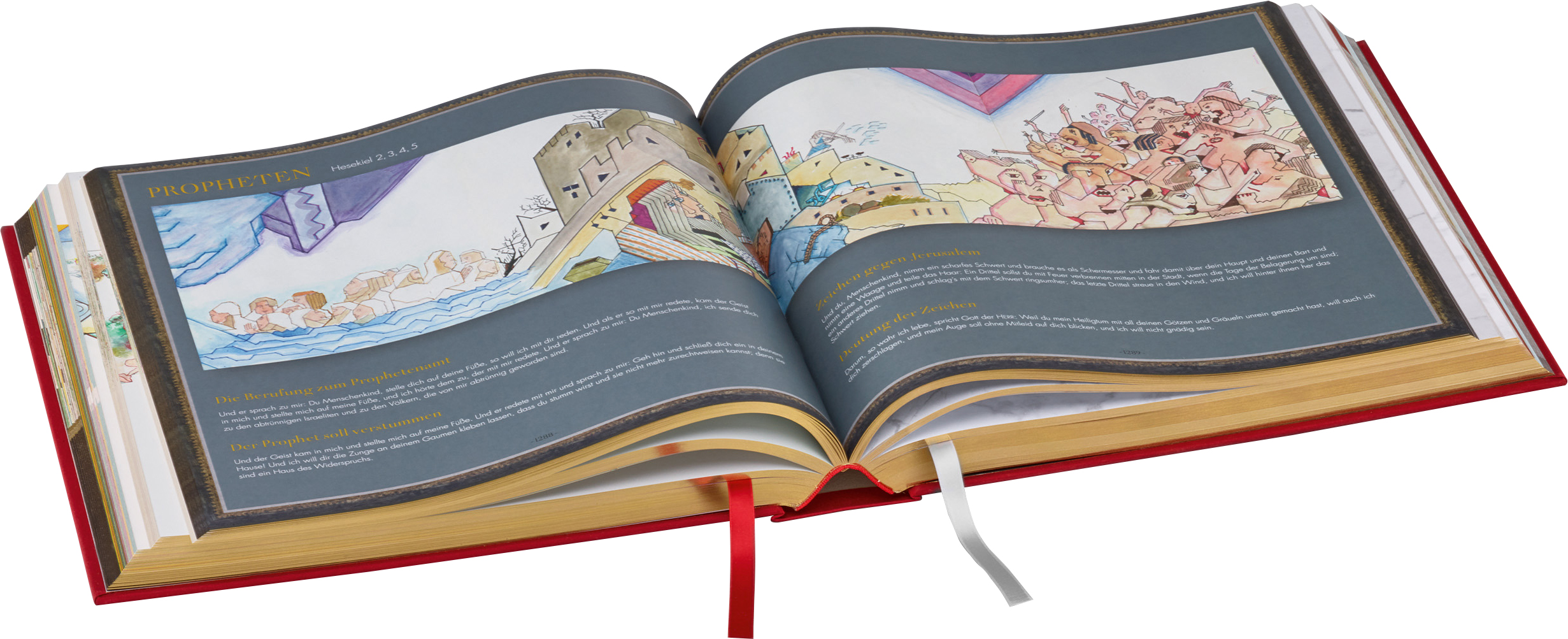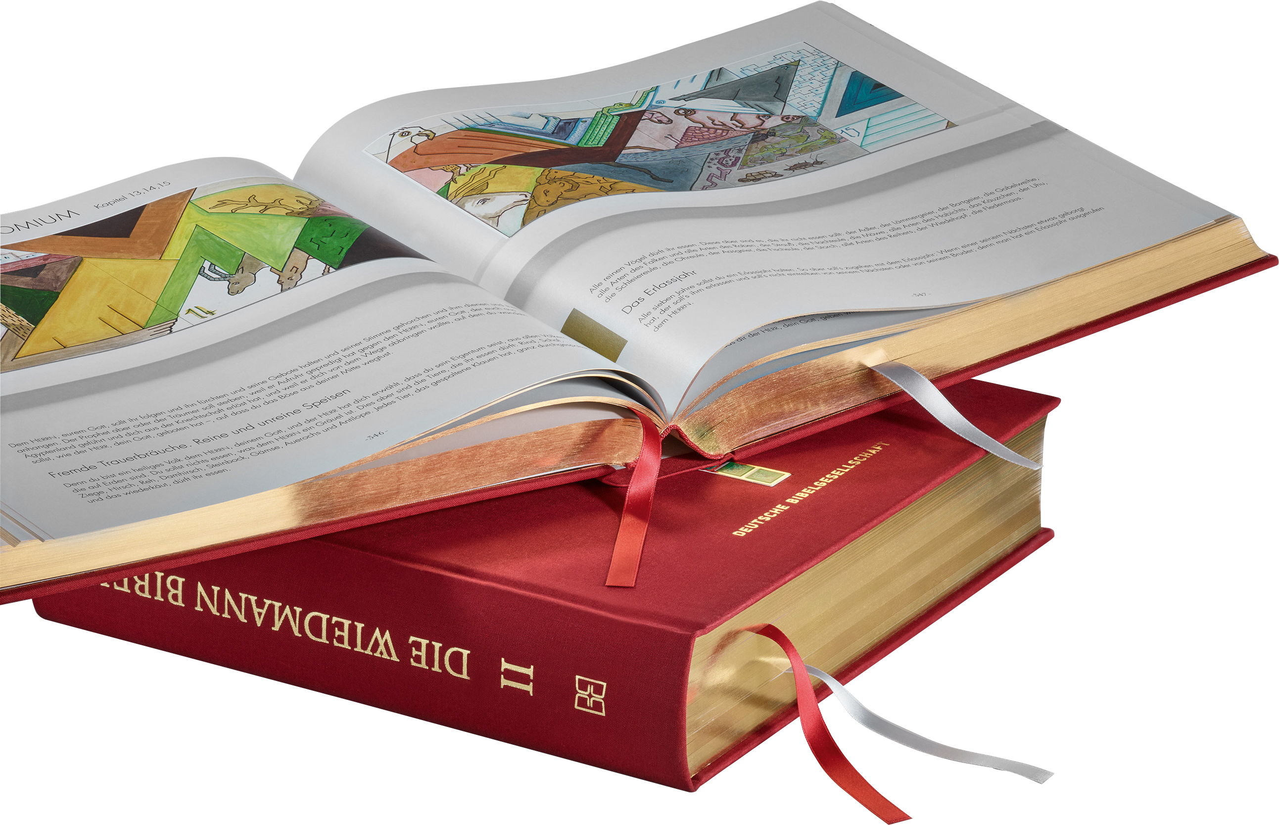 Geschaffen wurde diese einzigartige Bibel vom Stuttgarter Künstler und Kirchenmaler Willy Wiedmann (1929–2013). Er arbeitete 16 Jahre lang an den Bildern, die in dem von ihm selbst in den 1960er-Jahren entwickelten Polykonstil gemalt sind. Weitere Informationen zum Werk finden Sie auf der Website der Wiedmannbibel.