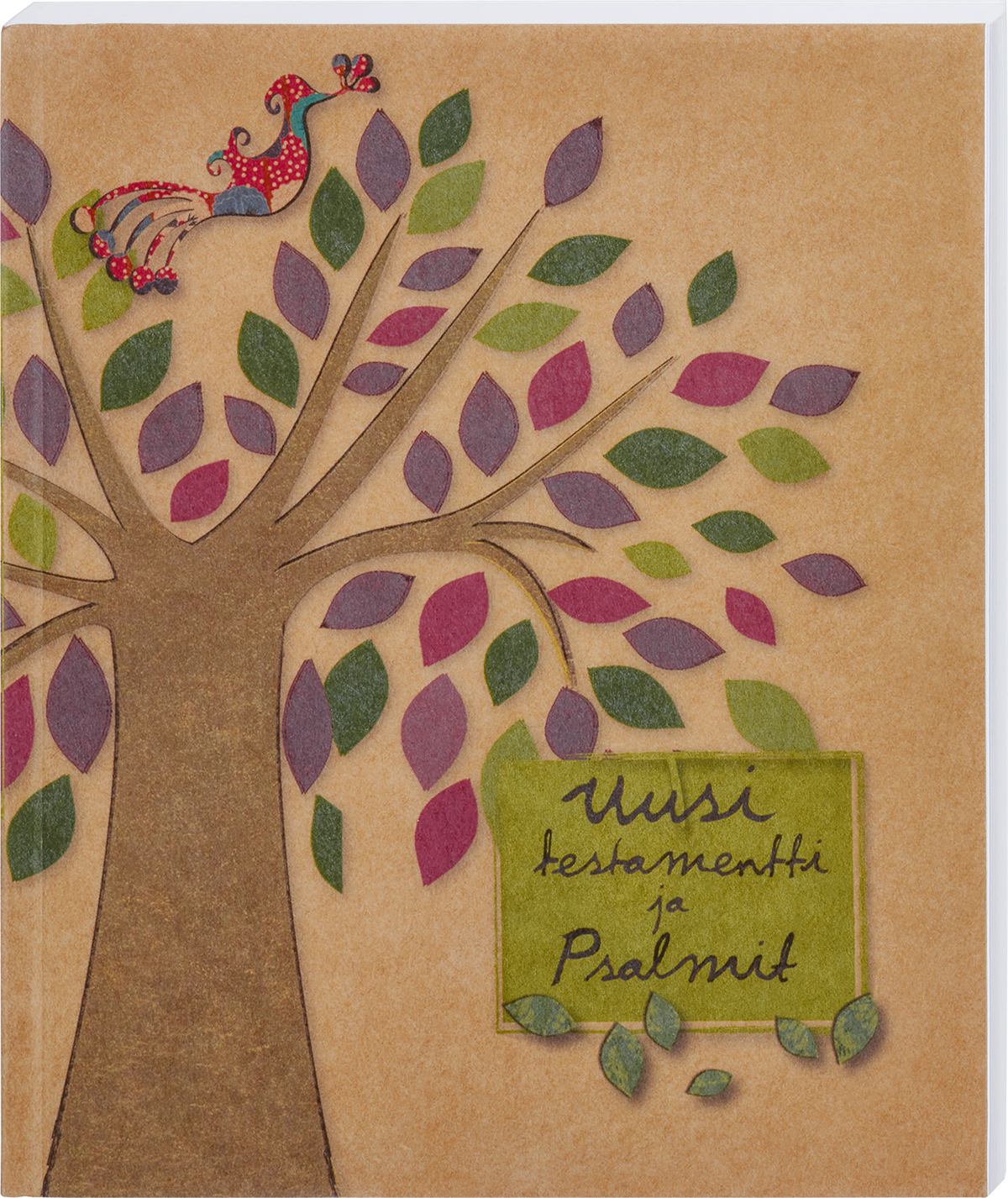 Die Ausgabe des Neuen Testaments mit Psalmen auf Finnisch ist zweispaltig gedruckt und hat einen farbigen, kartonierten Einband.