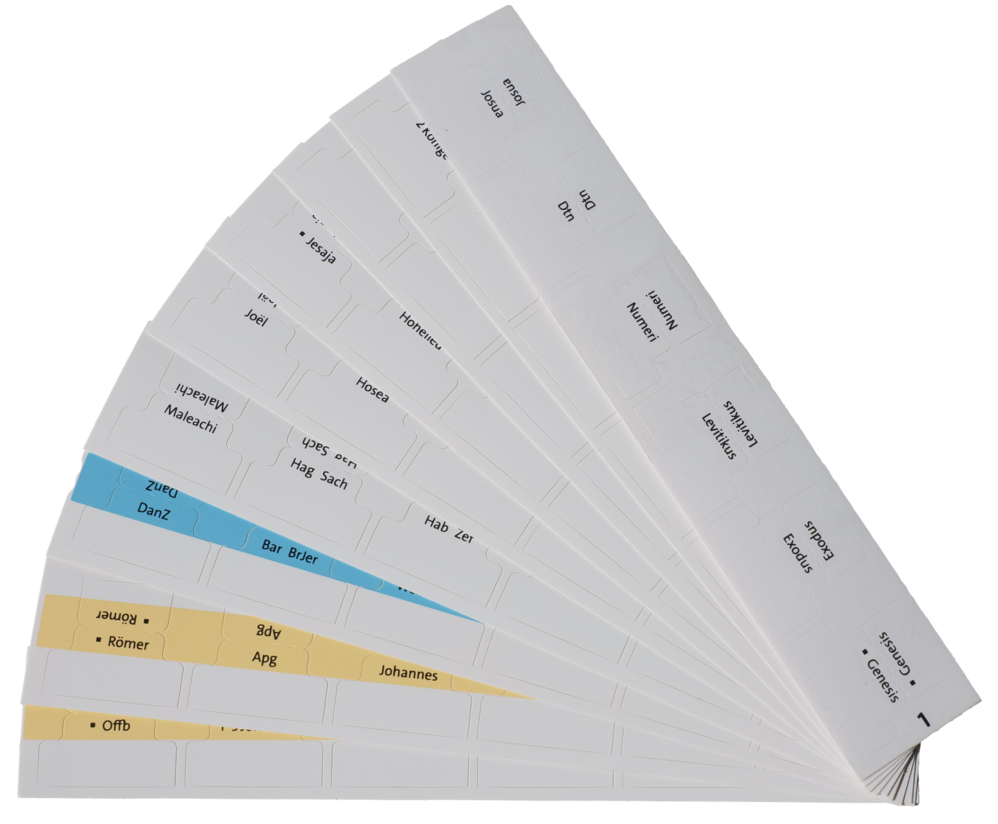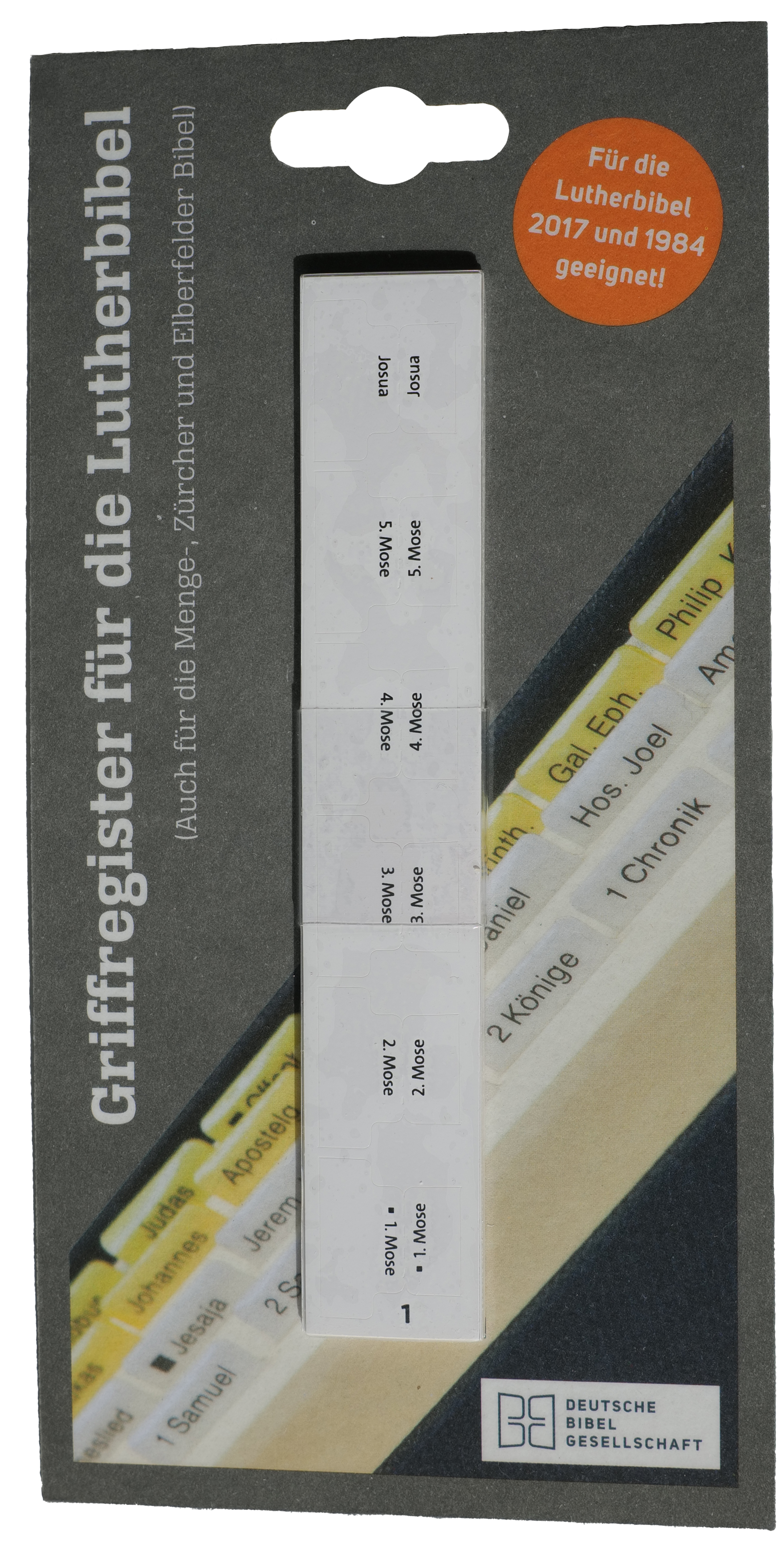 Wo steht noch gleich der Phillipperbrief? Wer mit einem Griff das gewünschte Buch in der Bibel finden will, für den ist ein Bibelgriffregister das richtige Hilfsmittel. Strapazierfähige kleine Registerfähnchen aus Kunststoff halten mindestens so lange wie eine Bibel, die gerne und viel gelesen wird. Einmal hineingeklebt, vereinfachen sie das Hin- und Herblättern und ermöglichen das rasche Nachschlagen von Querverweisen zu anderen biblischen Büchern.