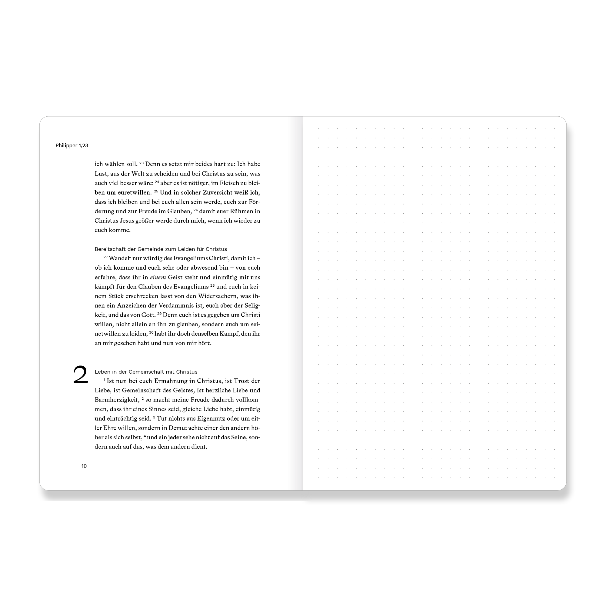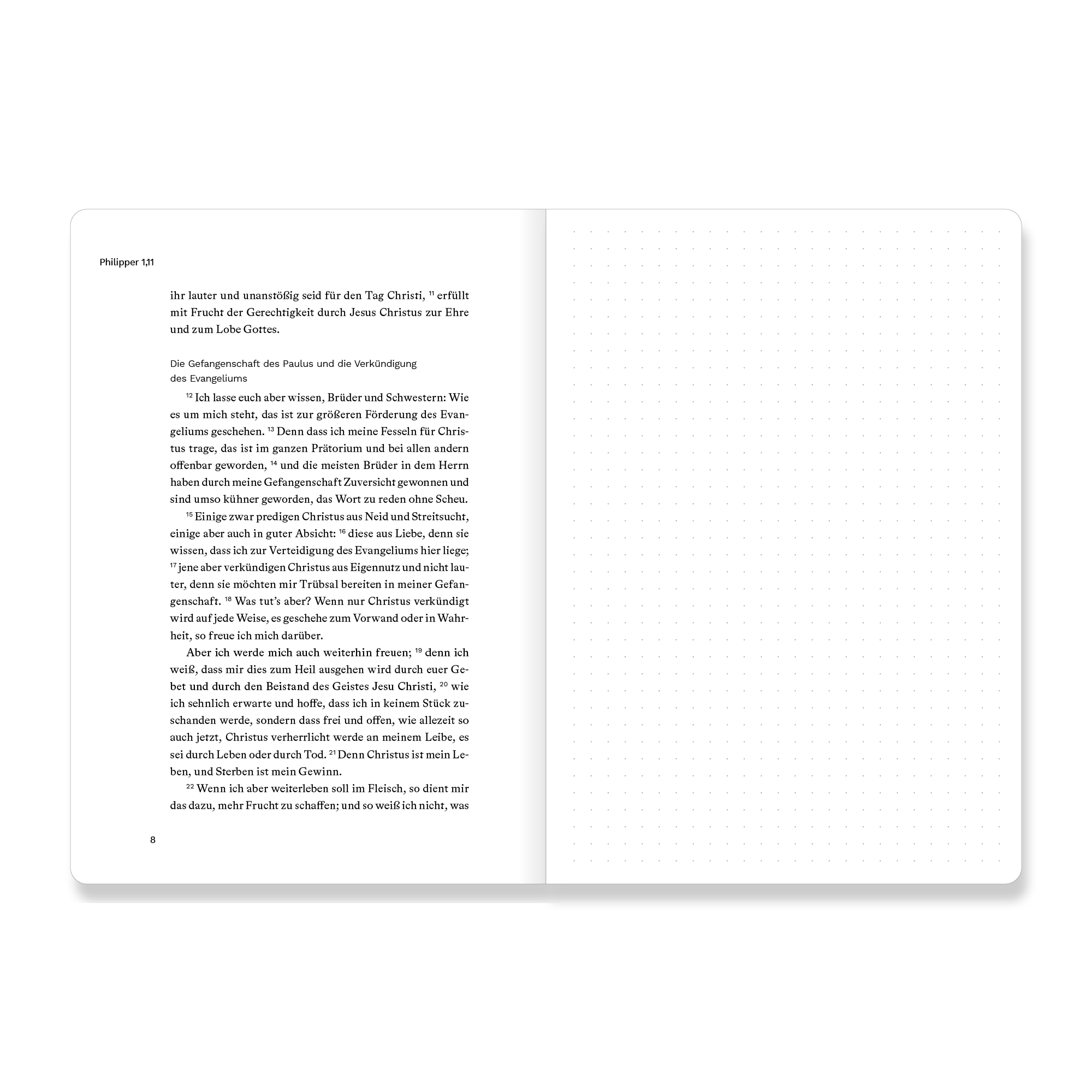 Dieses Bibeljournal kombiniert den vollständigen Bibeltext eines biblischen Buches (Luther 2017) und eine gegenüberliegende Seite mit dezentem Punktraster für deine persönlichen Notizen, Gedanken oder Gebete. So kannst du direkt neben dem Text festhalten, was dich beim Lesen bewegt.