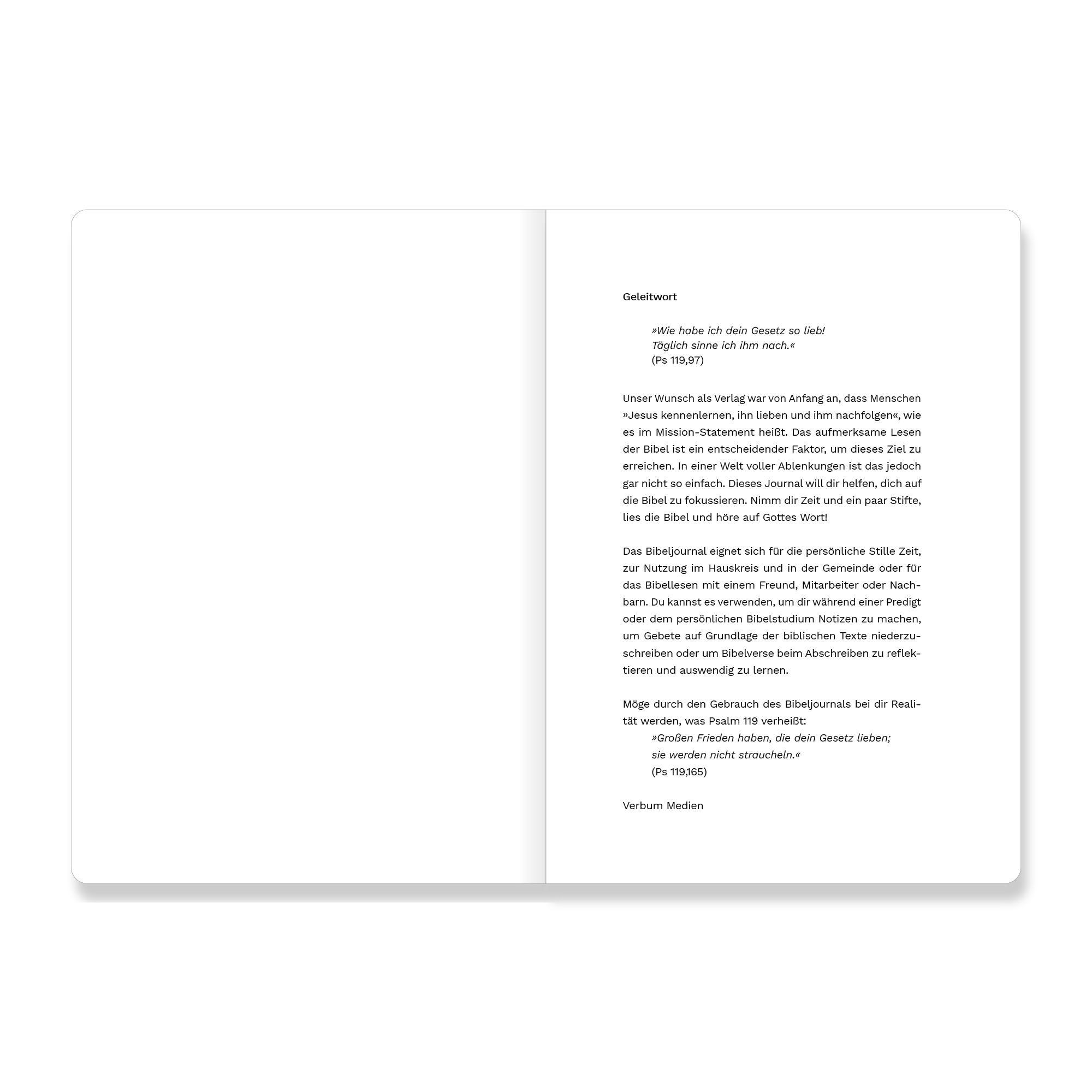Das Journal eignet sich perfekt für die tägliche Bibellese, die Arbeit in der Kleingruppe, das gemeinsame Lesen mit Freunden oder zum Mitschreiben während einer Predigt. Auch zum Abschreiben und Auswendiglernen von Bibelversen ist es ideal.