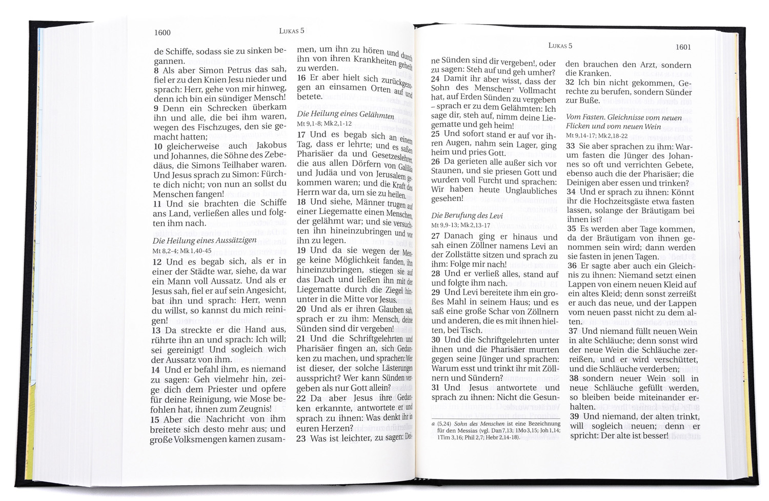 Das Buch zum Jubiläumsjahr!Die revidierte Lutherbibel in einer attraktiven Ausgabe. Ihre farbigen Sonderseiten vermitteln im Jubiläumsjahr viel Wissenswertes zu Luthers Wirken als Reformator und Bibelübersetzer – mit Hintergrundinformationen zur Revision 2017. Mit Apokryphen und farbigen Landkarten am Buchende.Inhaltsübersicht der Sonderseiten dieser exklusiven Jubiläumsausgabe:Martin Luther: Leben und GlaubenDie Jugendzeit 1483–1505Im Kloster 1505–1513Die reformatorische Wende und der Streit um den Ablass 1513–1518Der Prozess gegen Luther und das reformatorische Programm 1518–1521Die Wittenberger Unruhen und die Neuordnung des christlichen Lebens 1521–1524Der Bauernkrieg und Luthers Hochzeit 1525Die Speyrer Reichstage und das Marburger Religionsgespräch 1526–1529Die Katechismen und der Reichstag zu Augsburg 1529–1535Einigung im protestantischen Lager: Die Wittenberger Konkordie und die Schmalkaldischen Artikel 1536–1539Die letzten Lebensjahre Luthers 1539–1546Luthers Vorreden zur BibelDie Vorrede zum Alten TestamentDie fünf Bücher MoseDas Buch HiobDie PsalmenDie ProphetenDie Vorreden zu den ApokryphenDie Vorrede zum Neuen TestamentDie EvangelienDer Brief des Paulus an die RömerDie Briefe des PetrusDer Brief an die HebräerDer Brief des JakobusDie Offenbarung des JohannesDem Volk aufs Maul gesehen: Martin Luther als BibelübersetzerLuthers Bedeutung für die Geschichte der deutschen SpracheDie Anfänge von Luthers Bibel übersetzung›Junker Jörgs‹ Rekordleistung: Das Neue Testament in elf WochenLuthers Sprach-Kompetenz – Deutsch und GriechischZwölf Jahre Arbeit am Alten TestamentLuthers ÜbersetzungsmethodeWas heißt »dem Volk aufs Maul sehen«? »Rein und klar Deutsch geredet« »Nicht von dem Wort weichen«Theologische Schwerpunkte: »Das lautere Evangelium«Reformatorische ›Hauptwörter‹Worte, die haften bleiben und ins Herz dringenVon Luthers Bibel zur heutigen LutherbibelVon der ersten Vollbibel bis zu Luthers Tod 1546Spätere Veränderungen an Luthers BibelübersetzungVereinheitlichungen und Modernisierungen der LutherbibelDie Revision der Lutherbibel zum Reformationsjahr 2017Passende Widmungsblätter zum Download finden Sie hier_____________________________________________________________Bei Fragen zur Produktsicherheit wenden Sie sich bitte an:Deutsche BibelgesellschaftBalinger Str. 31 A70567 Stuttgartproduktsicherheit@dbg.de